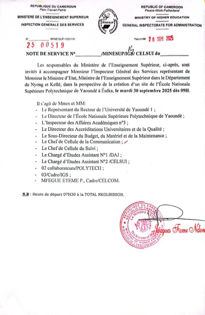 Le célèbre site d’Ilanga va être visité ce mardi 30 Septembre 2025 car disposant des infrastructures qui peuvent recevoir les tous premiers étudiants. La délégation de 15 personnes désignée par le Ministre de l’Enseignement supérieur le Pr Jacques Fame Ndongo va être dirigée par le représentant du Recteur de l’Université de Yaoundé 1 pour apprécier le site ciblé.